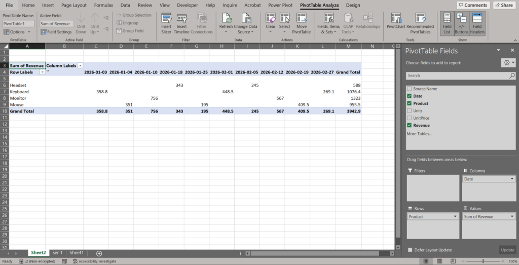 2. Drag fields: Rows: ProductColumns: MonthStartValues: Revenue (Sum).
