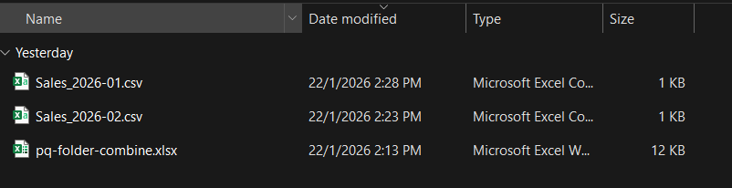 Fix: Keep the folder tidy or add a Name filter (e.g., only Sales_20), and consider archiving old CSVs to a subfolder that the query ignores.