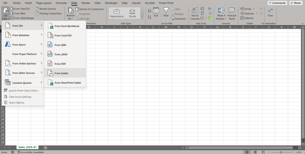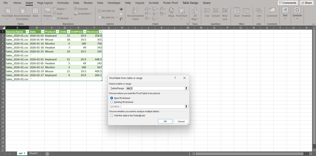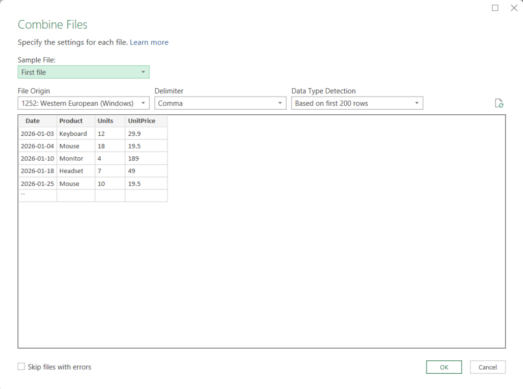 • A single table that appends all CSVs in a folder (e.g., Sales_2026-01.csv, Sales_2026-02.csv, …).