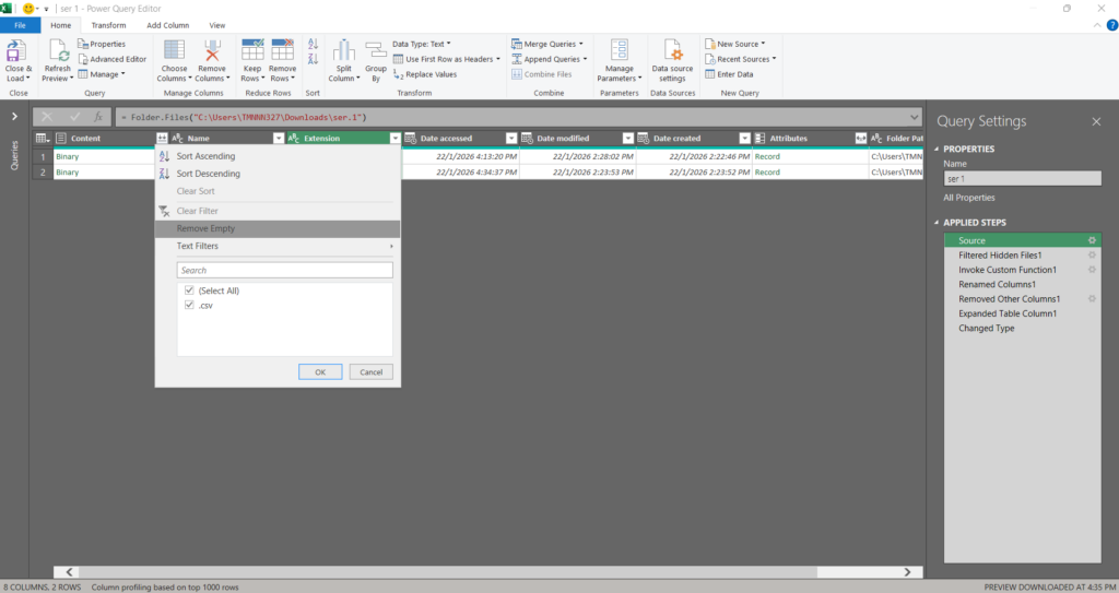 • If your files follow a naming convention (e.g., Sales_YYYY-MM.csv), you can also keep rows where Name begins with Sales_.