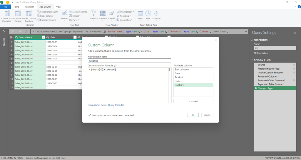 • Add a calculated column Revenue = Units * UnitPrice (Add Column → Custom Column).