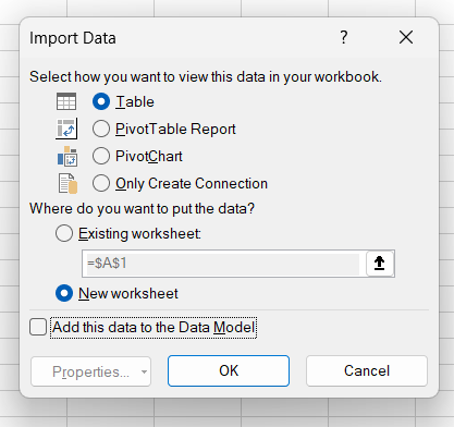 // 3) Import each CSV as a table (let Excel infer delimiter/encoding)